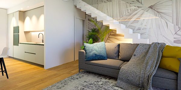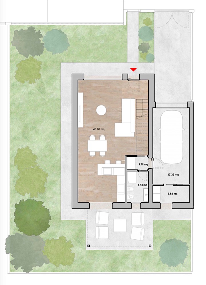 - al piano terra, living open space con cucina a vista di circa 47 mq con uscita su terrazzo, ripostiglio sottoscala, bagno, garage e lavanderia;